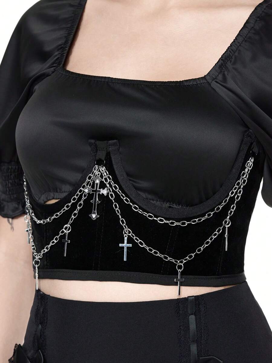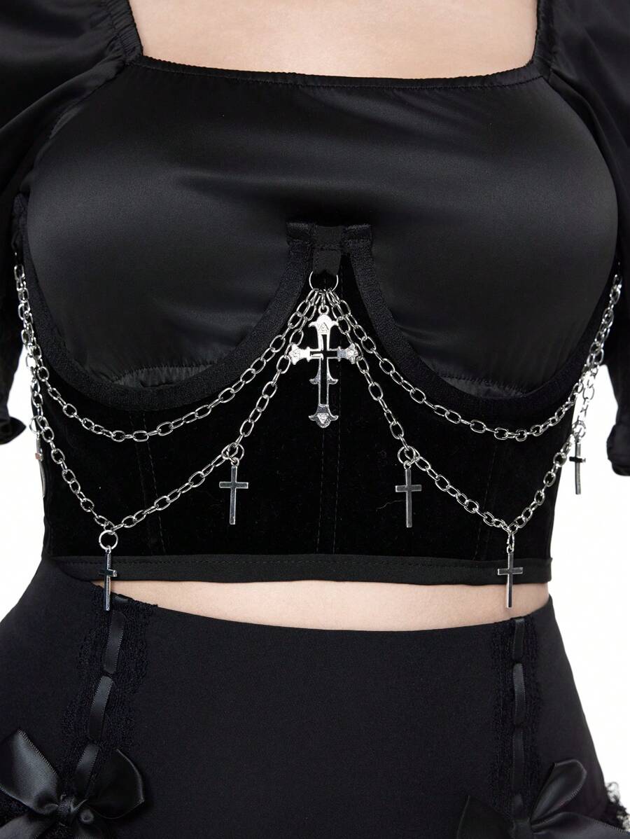 Grunge Punk 1 pieza Corsé gótico con decoración de cadena de cruz de terciopelo negro, cinturón de estilo gótico accesorio para vestido, atuendo navideño de estilo gótico