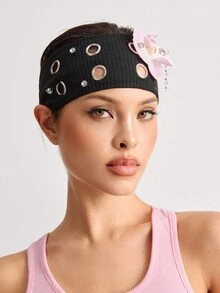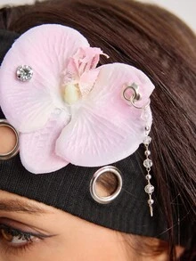 Grunge Punk 1 pieza Diadema con cadena hueca de estilo punk, diadema elástica floral de cristal de color rosa estilo Y2K, accesorio de pelo versátil
