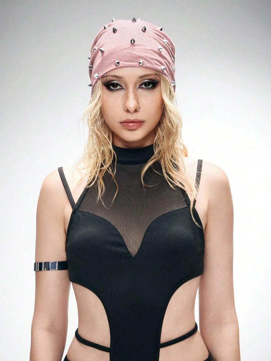 Grunge Punk 1 pieza Gorro de punto liviano con tachuelas de estilo punk, sombrero flojo sólido de color rosa pálido vintage de alta calidad de estilo Y2K, uso casual de moda para todas las temporadas