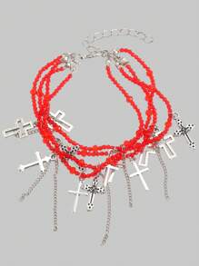 Grunge Punk 1 pieza Pulsera decorativa con cadena de cruz multicapa, cuentas de cristal y borlas, estilo gótico oscuro para mujeres