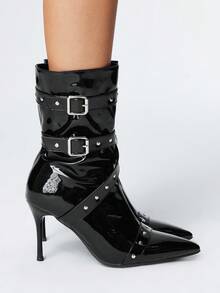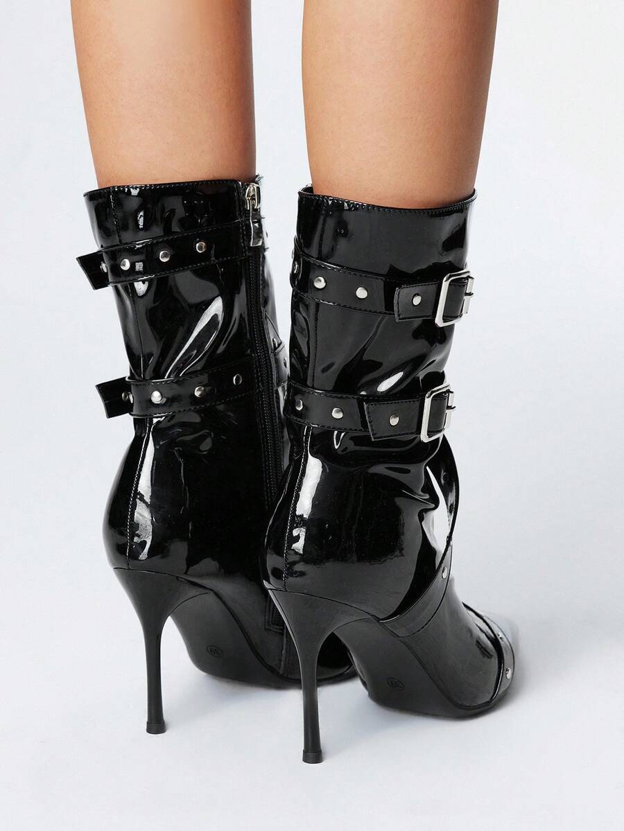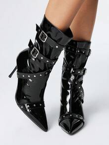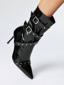 Grunge Punk Botas cortas de tacón alto con puntera puntiaguda y tachuelas, estilo otoño/invierno 2025. Botas con hebilla para mujer, tacón de aguja