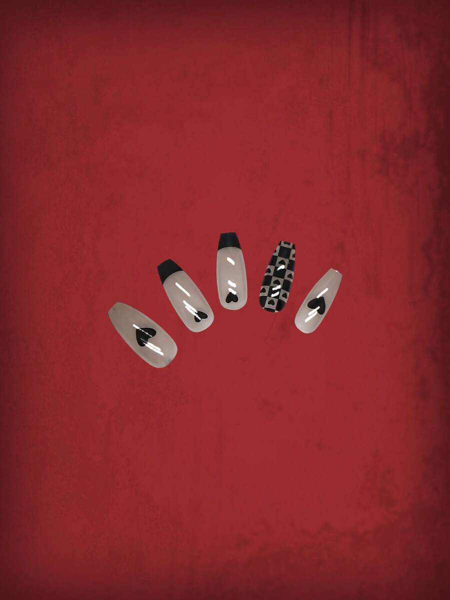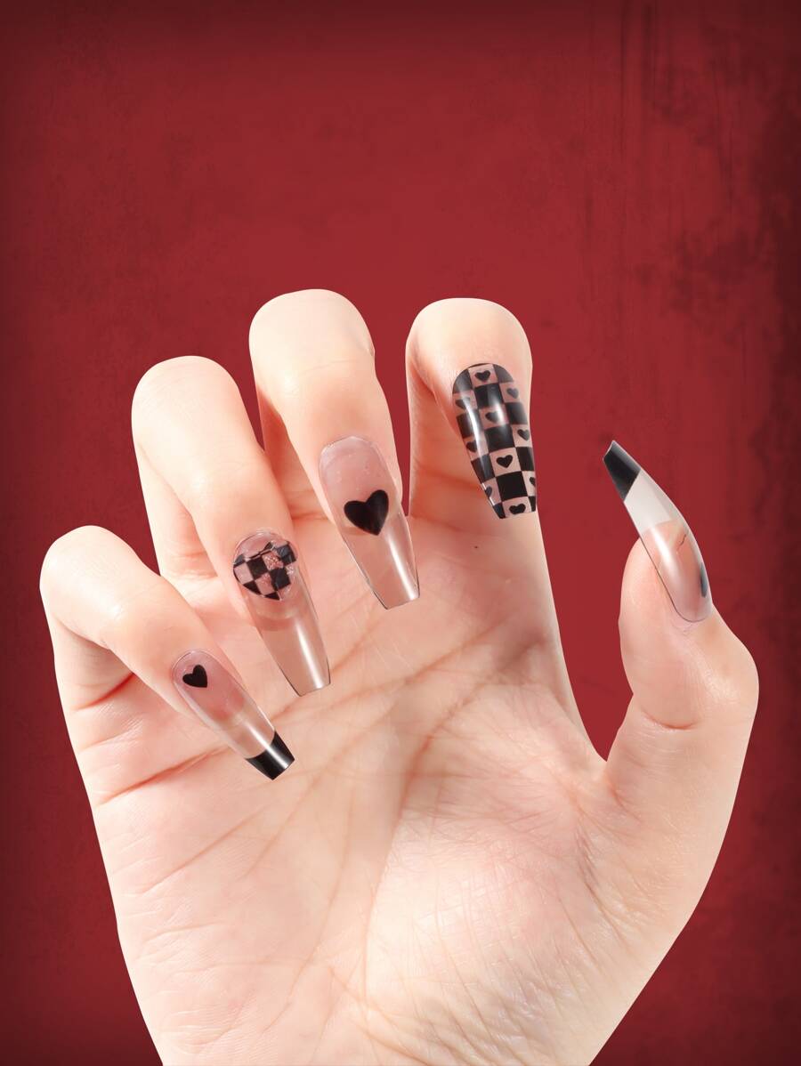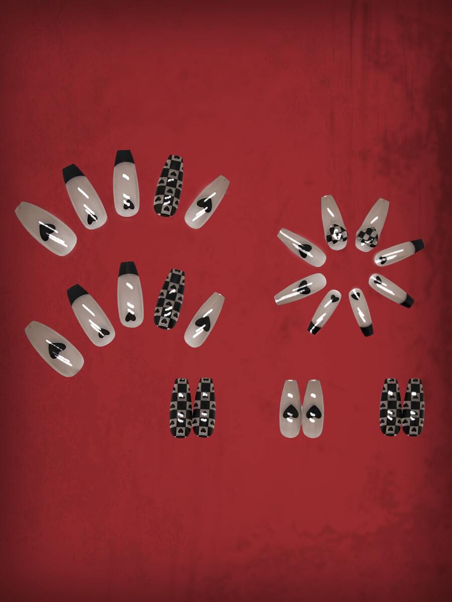 Grunge Punk 24 piezas ataúd con estampado de corazón Uña postiza & 1 hoja cinta