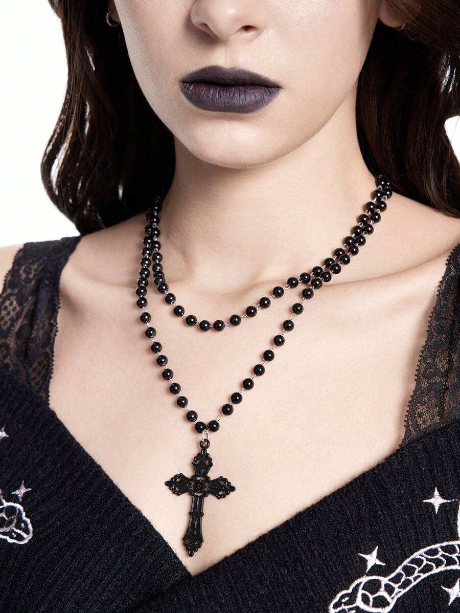 Grunge Punk 2 piezas Collar de múltiples capas con cuentas y colgante de cruz en estilo gótico para mujeres