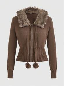Grunge Punk Chaqueta de cárdigan con cuello de Borg, detalle de pompón, para escuela, casual de primavera/otoño para damas, contraste esponjoso, manga regular con cremallera, cuello slim fit de color marrón liso, abrigo de invierno, moda de invierno, blusas de manga larga