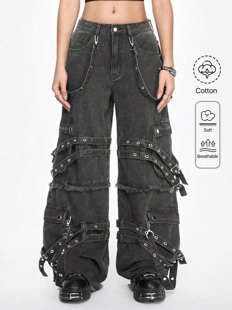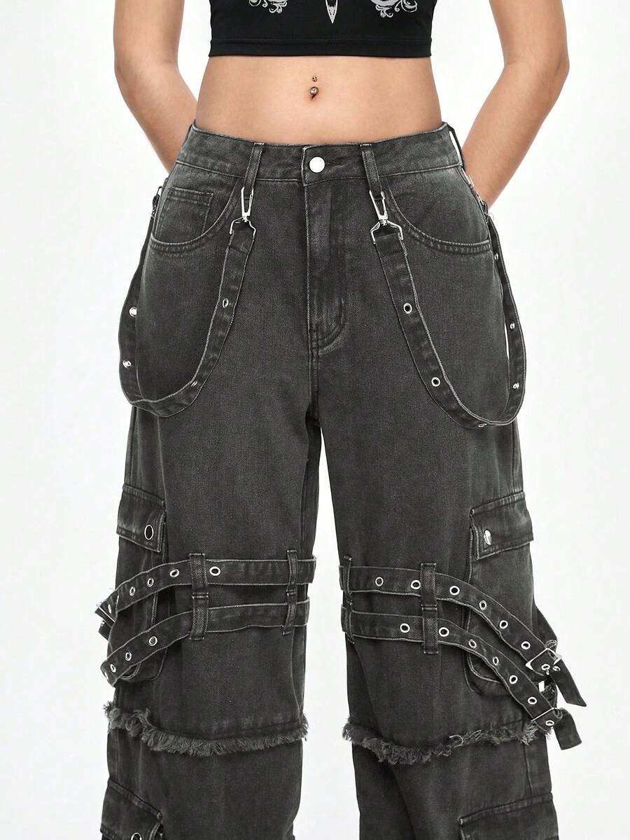 Grunge Punk Pantalones vaqueros de pierna ancha para mujer con decoración de cinta y tejido metálico, estilo casual y punk chic