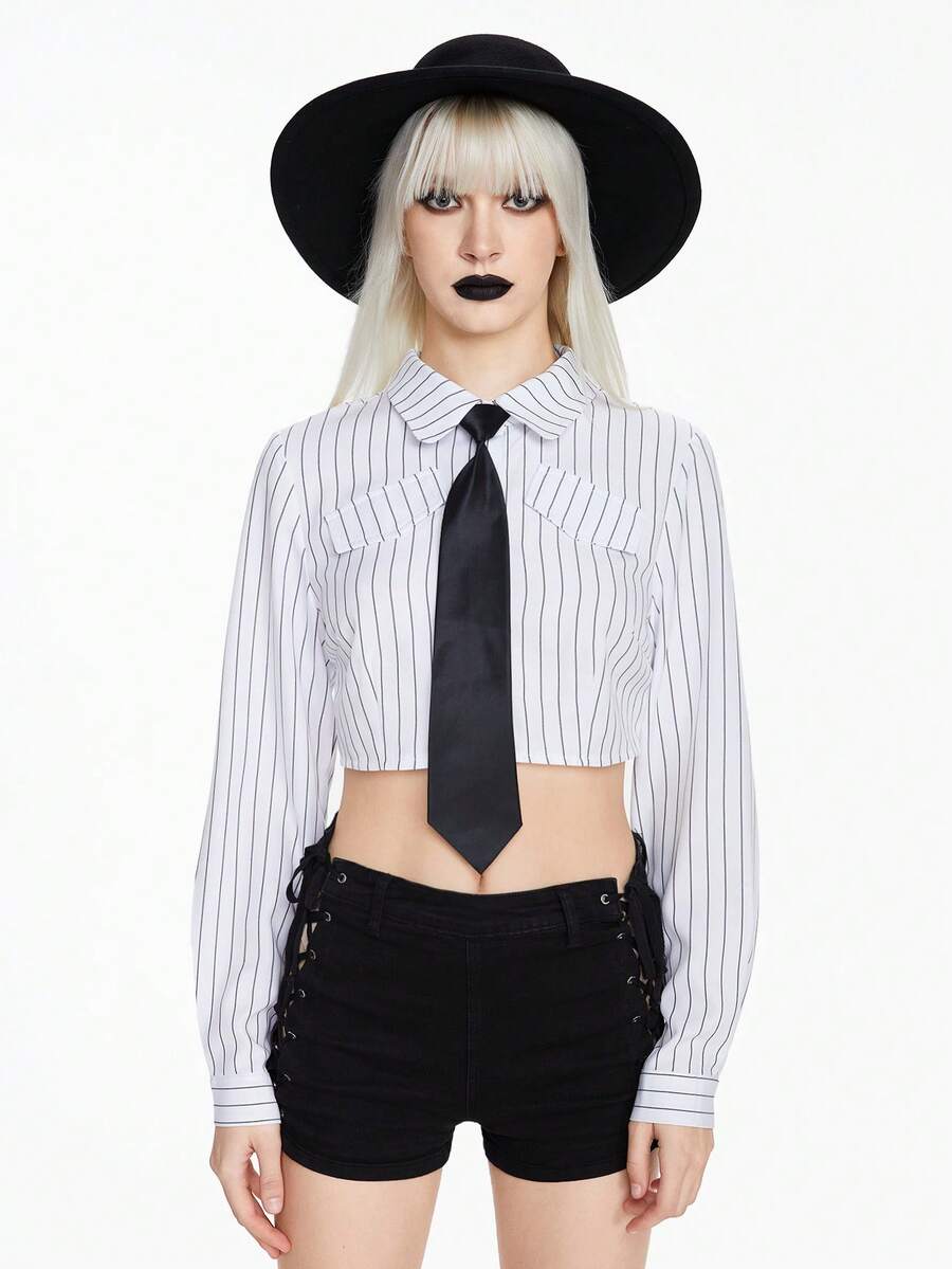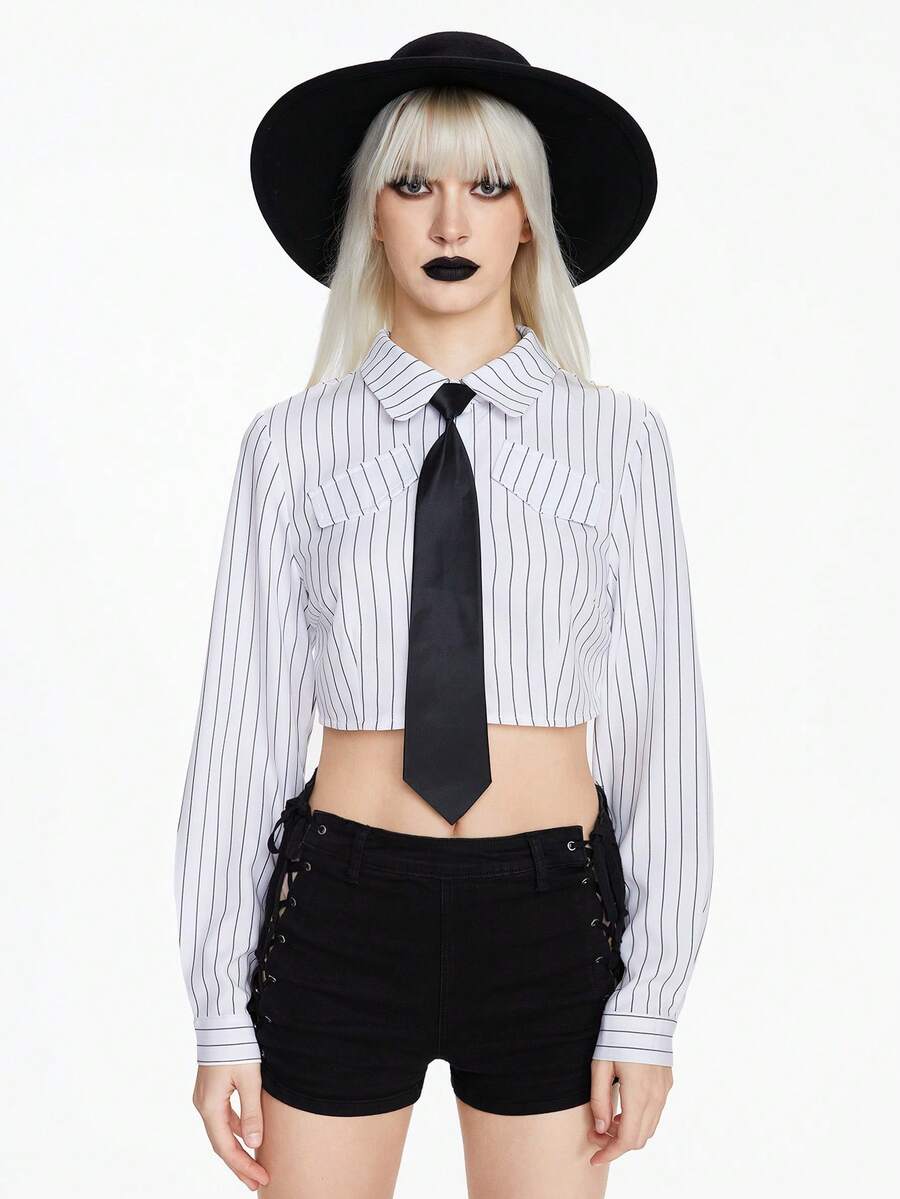 Grunge Punk Camisa de manga larga con cuello desmontable, de estilo rayado delgado, tejido, versátil y casual, para el estilo universitario