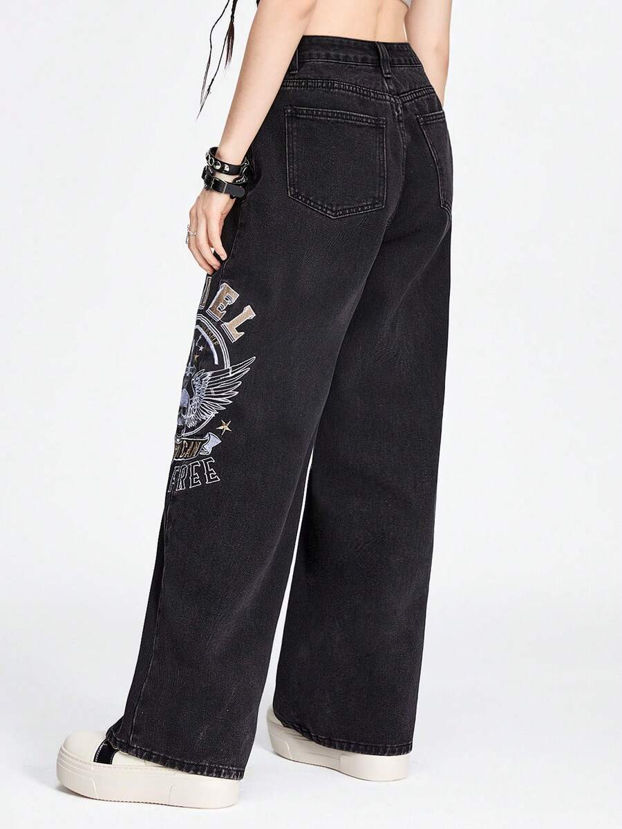 Grunge Punk Jeans de mujer de pierna recta y holgados en estilo de ropa callejera con placa de calavera, eslogan, bordado de alas y efecto lavado