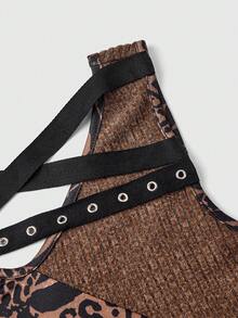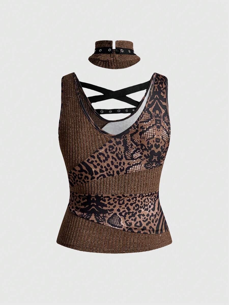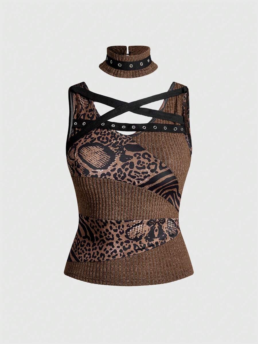 Grunge Punk Top ajustado con textura acanalada de estampado de piel de serpiente y diseño de patchwork con cruce de tiras
