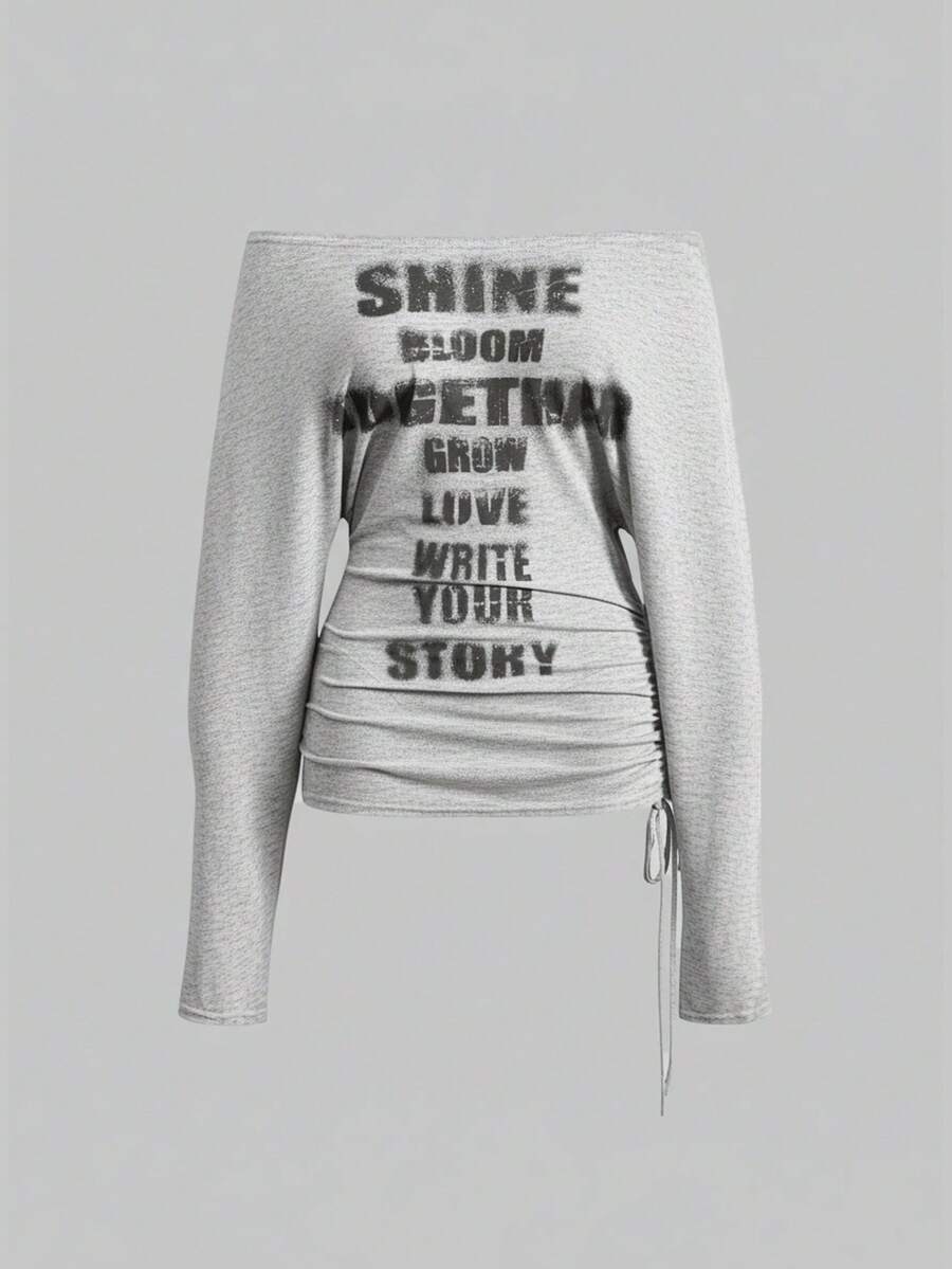 Grunge Punk Camiseta de manga larga con hombros descubiertos con estampado de cruz y letras para mujeres, estilo romántico punk