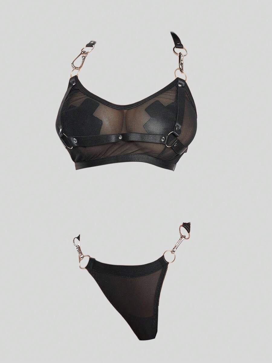 Grunge Punk Conjunto de lencería sexy y reveladora con mochila de malla con hebilla de metal punk oscuro