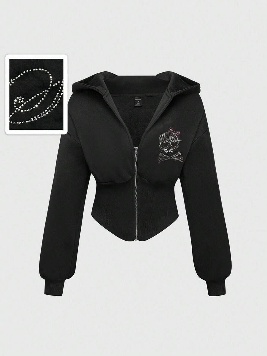 Grunge Punk Sudadera con capucha sexy de corte bajo con estampado negro de calavera, lazo de strass y diseño sexy para mujer