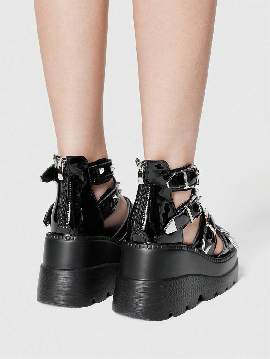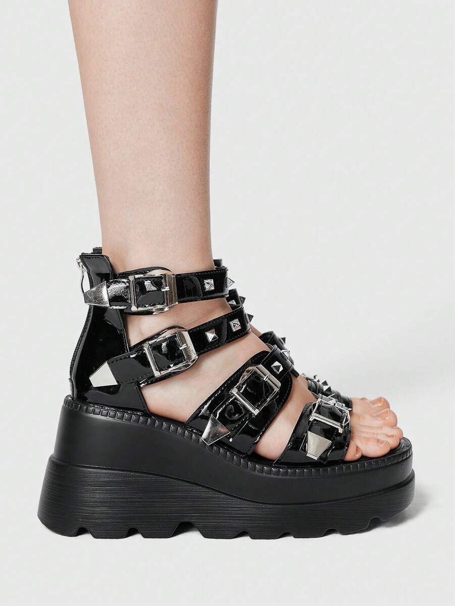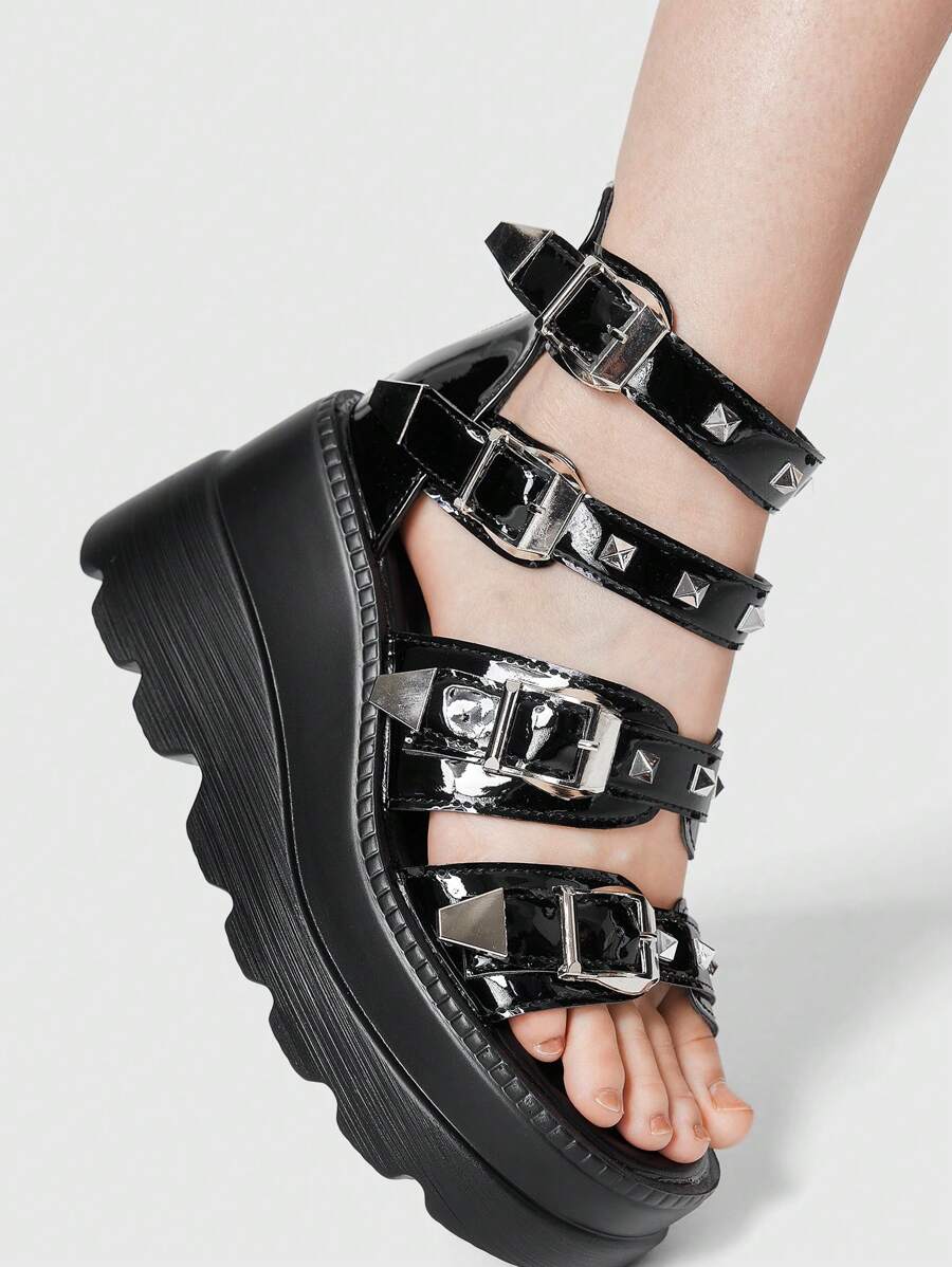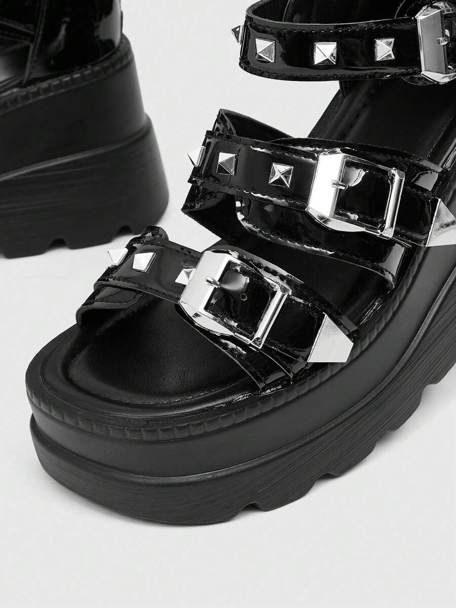 Grunge Punk Sandalias negras de PU retro con hebilla metálica, diseño de punta abierta, plataforma gruesa y tacón de 7,5 cm, adecuadas para salidas de verano y citas