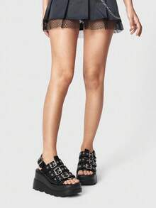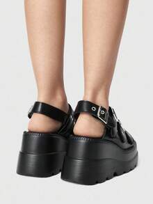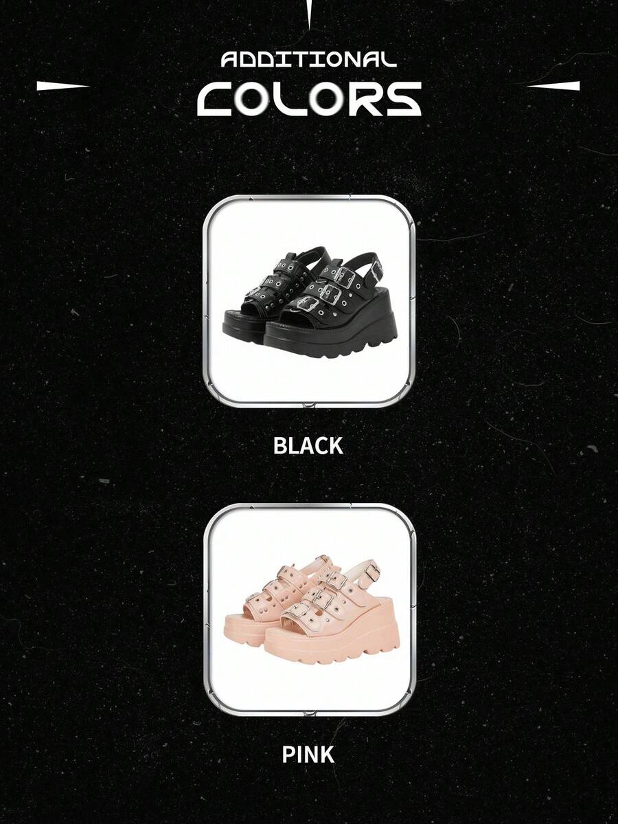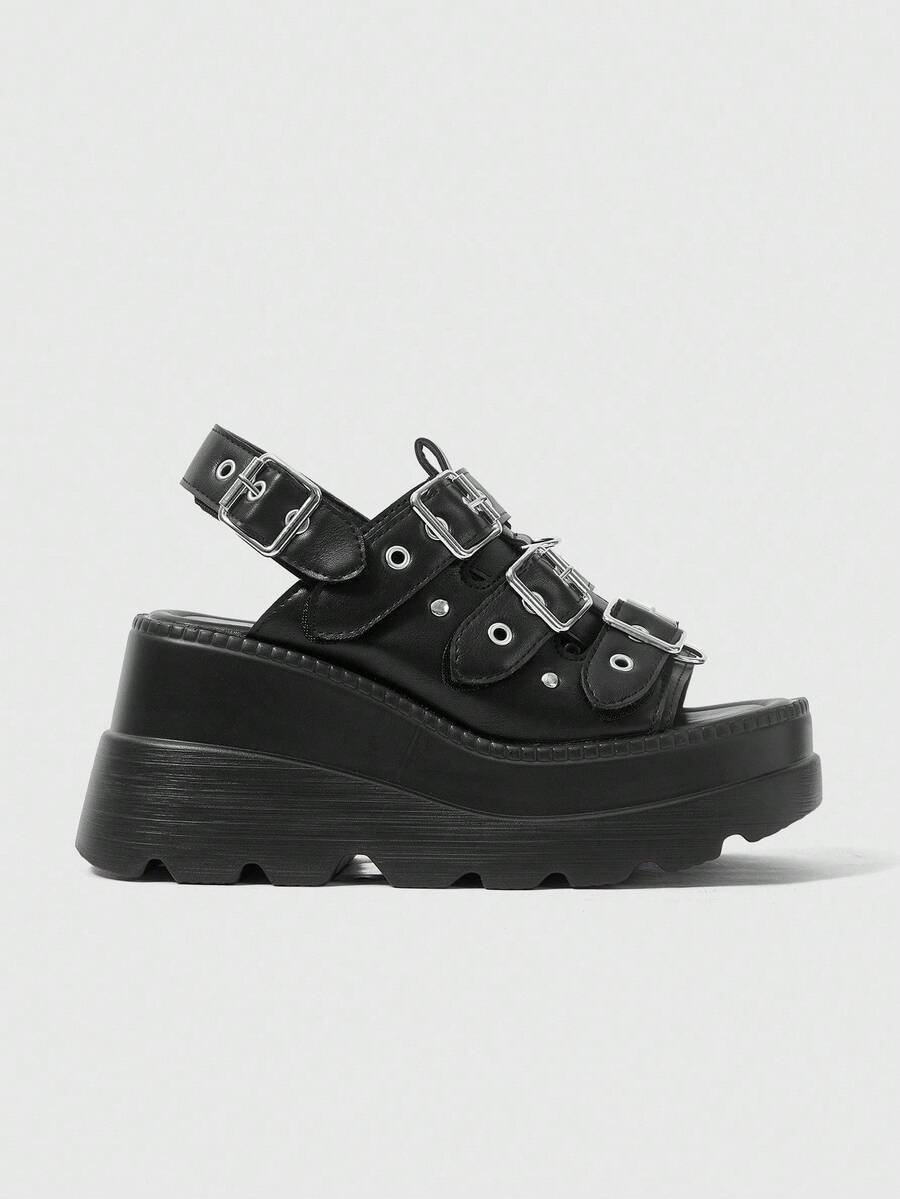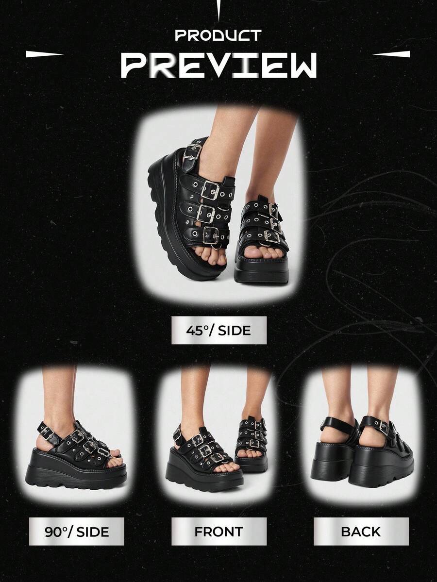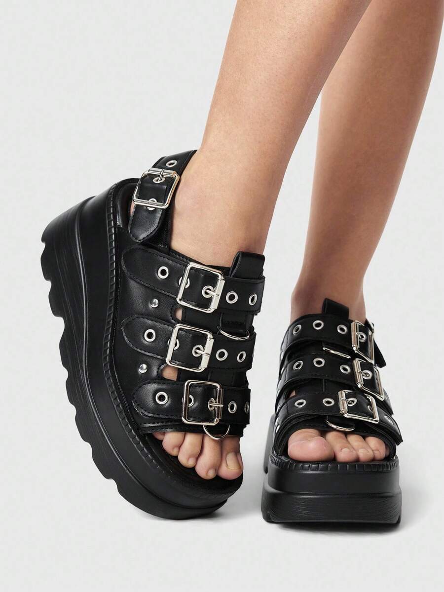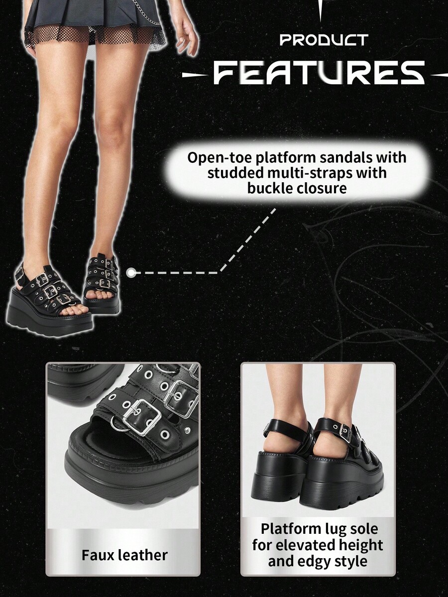 Grunge Punk Sandalias negras (PU) con hebilla metálica elegante, diseño de dedo abierto, suela gruesa, tacón plano de 7,5 cm, estilo retro. Adecuadas para salidas de verano, citas y talla grande.