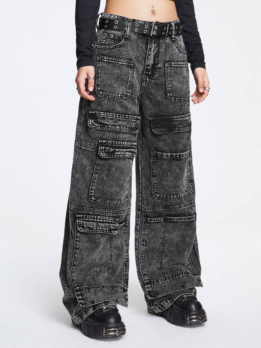 Grunge Punk Jeans cargo con bolsillo con solapa