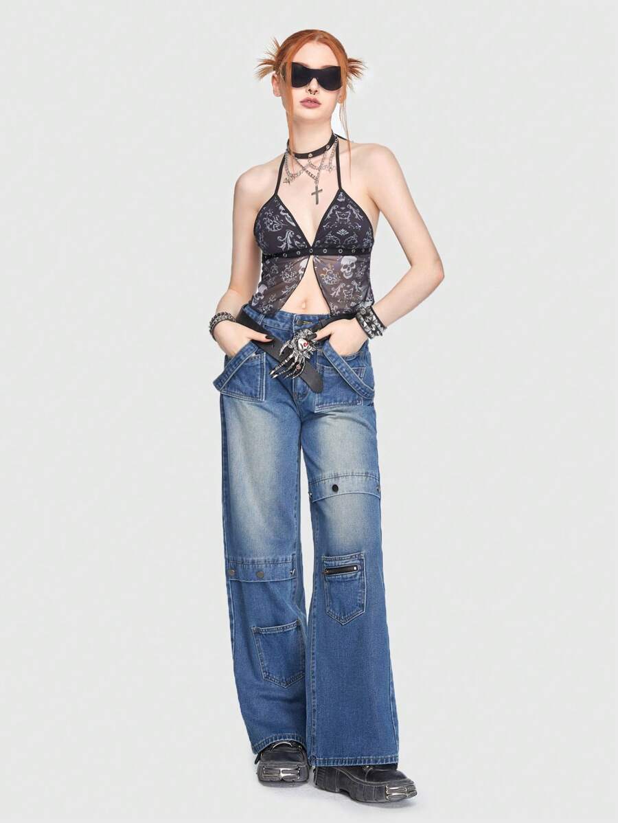 Grunge Punk Jeans De Pierna Ancha Con Bolsillos Con Solapa