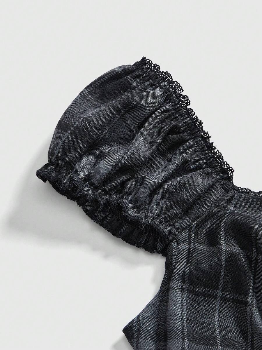Grunge Punk Vestido corto para niñas con mangas abullonadas, cintura ajustada, volantes con encaje y estampado a cuadros