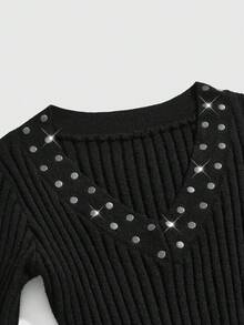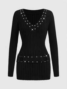 Grunge Punk Suéter de mujer con cuello en V profundo, remaches de bronce en la cintura y estilo grunge rock