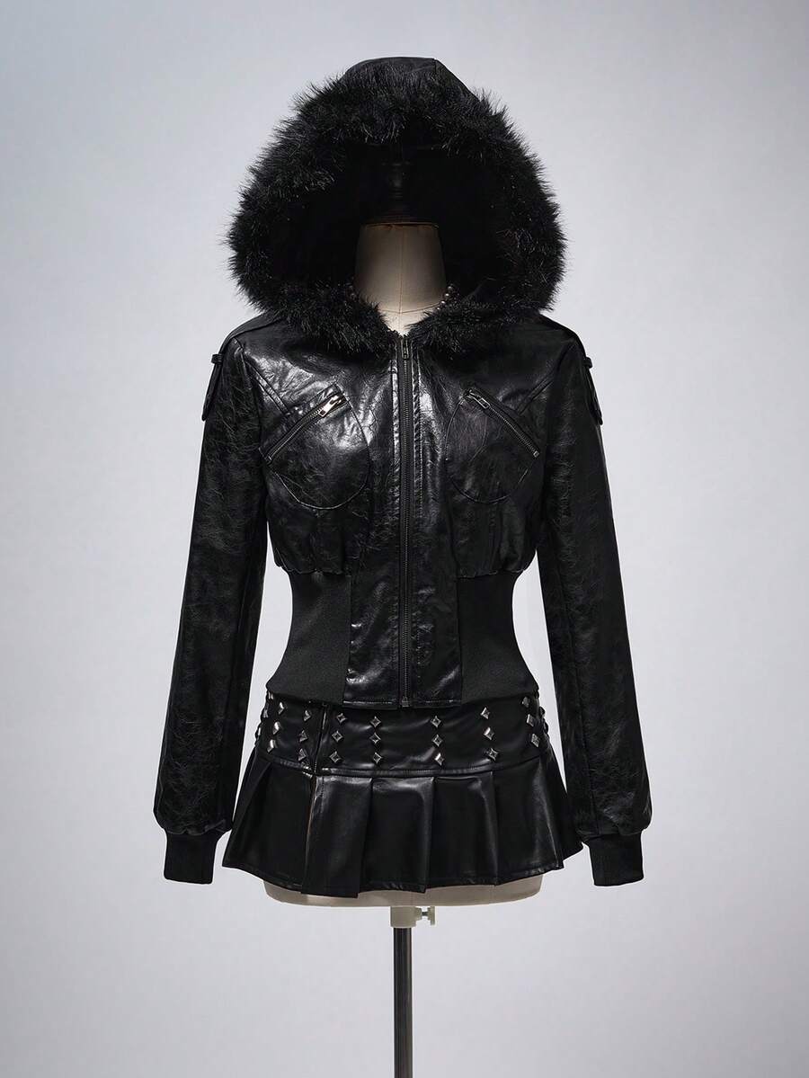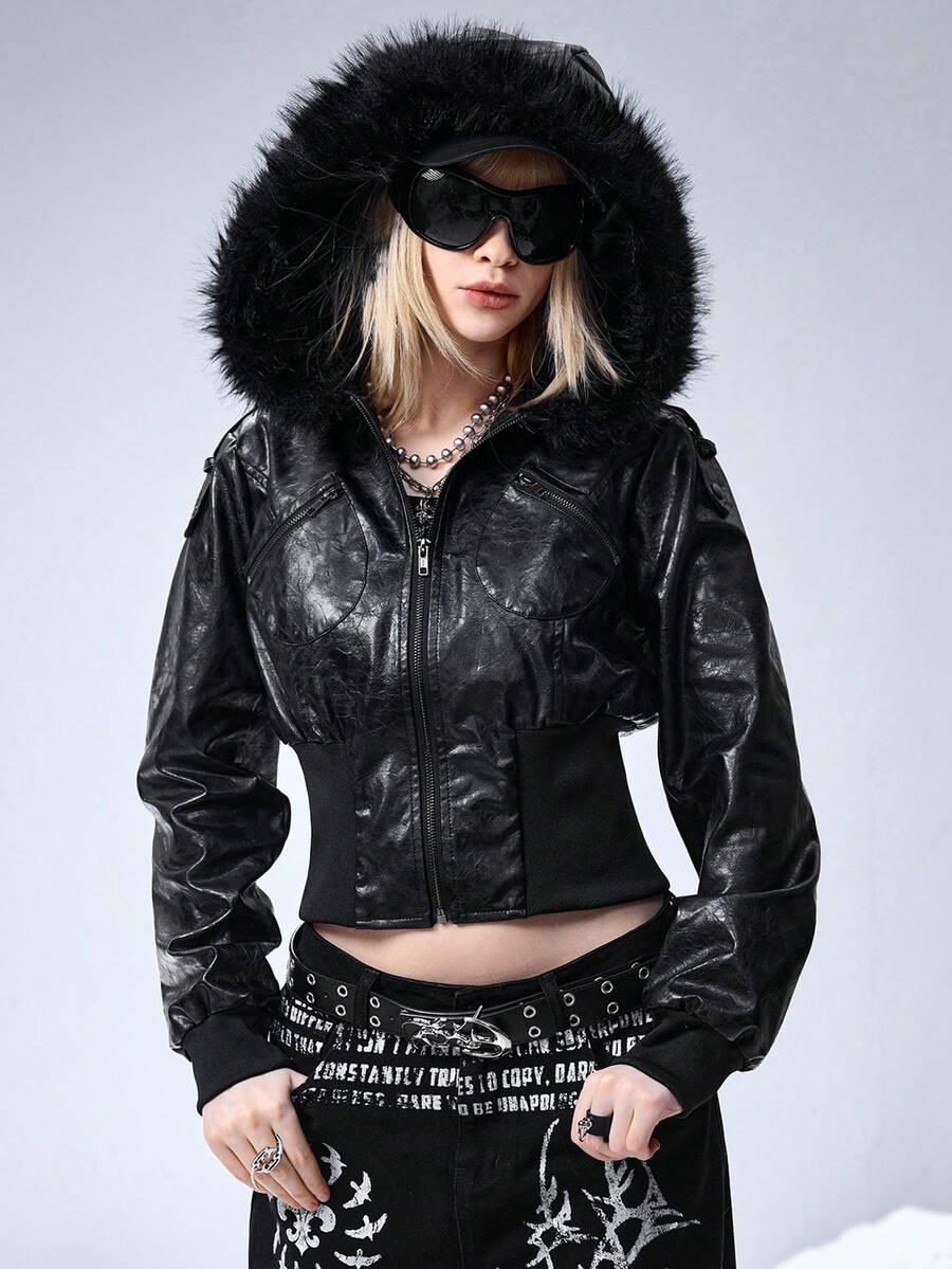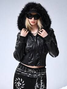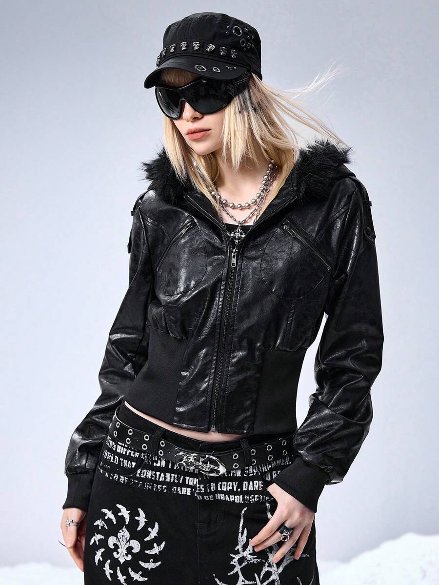 Grunge Punk Chaqueta con capucha de cuello de piel, ajustada y de estilo punk con relieve de piel sintética de PU, estilo Kpop