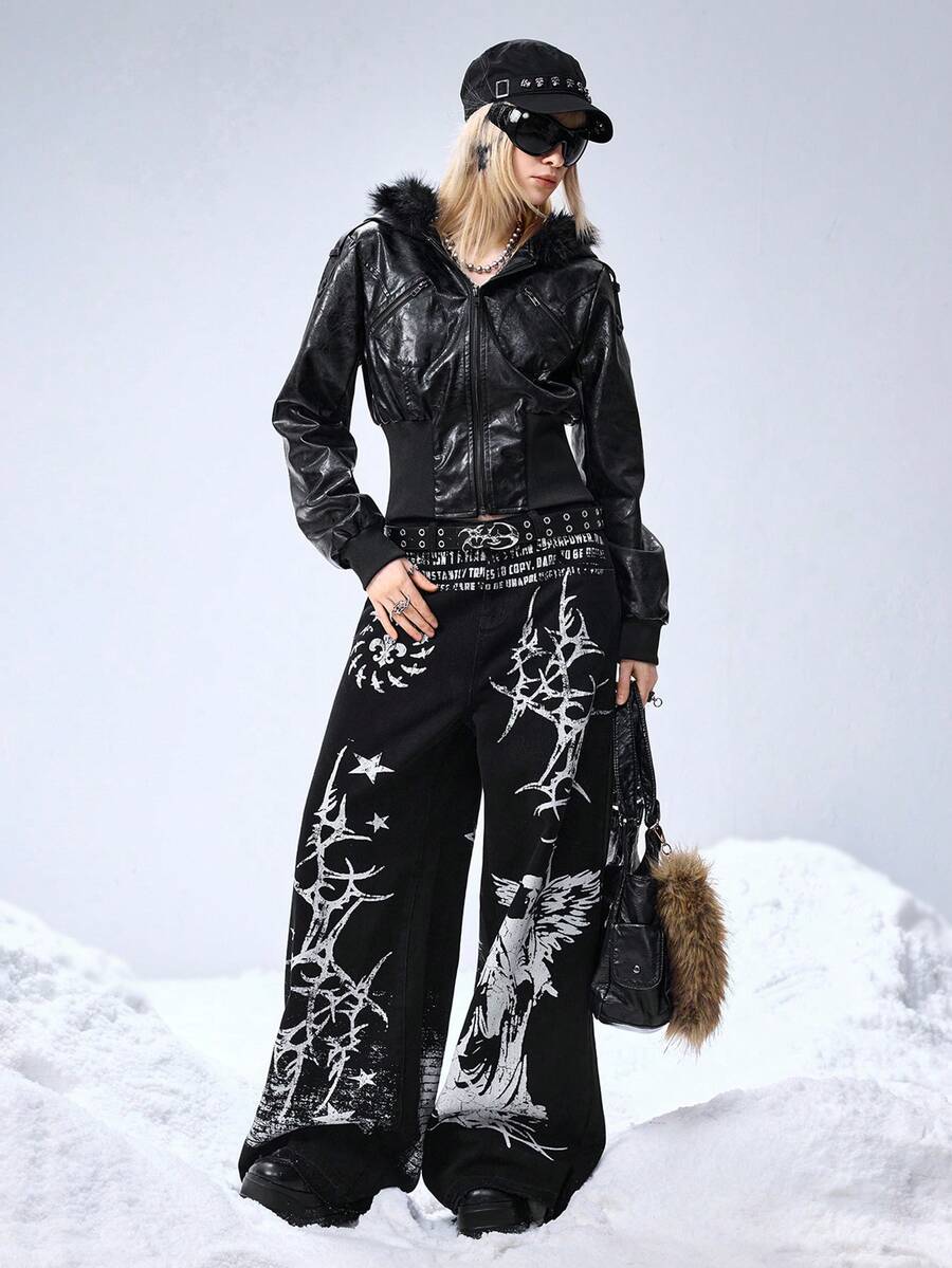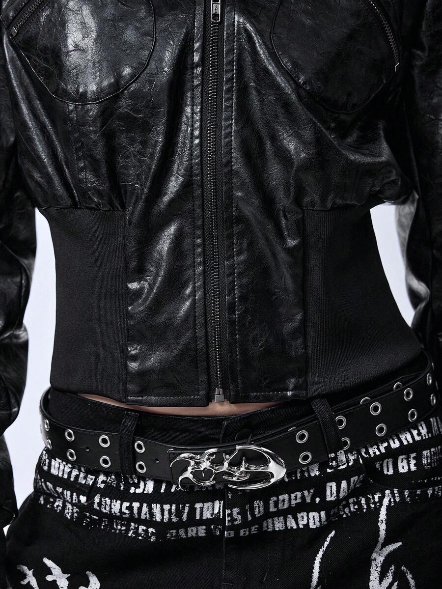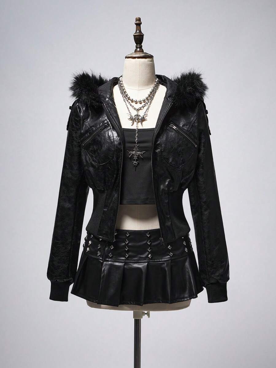 Grunge Punk Chaqueta con capucha de cuello de piel, ajustada y de estilo punk con relieve de piel sintética de PU, estilo Kpop