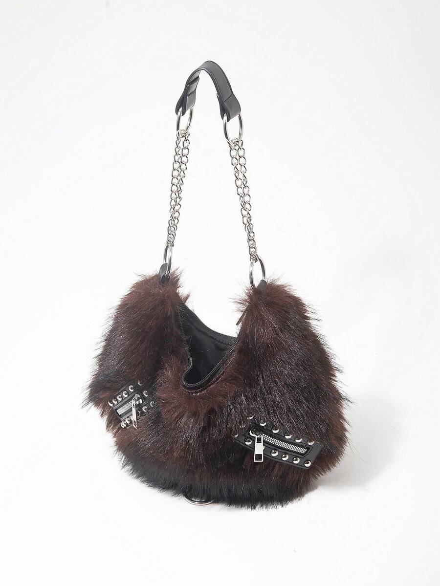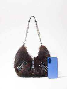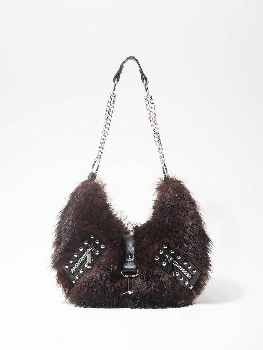 Grunge Punk Bolso de hombro para damas y mujeres, bolso hobo, de piel sintética, peludo, bolso de peluche, con remaches, de moda, personalizado, versátil, para la calle, dulce y fresco para chicas, chicas calientes, punk, Y2K, diario, otoño e invierno (patrón aleatorio)