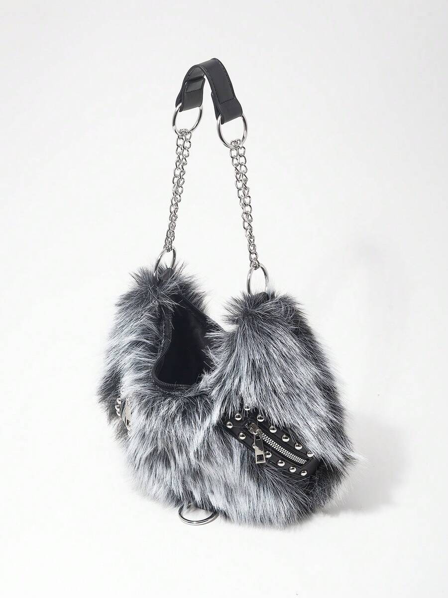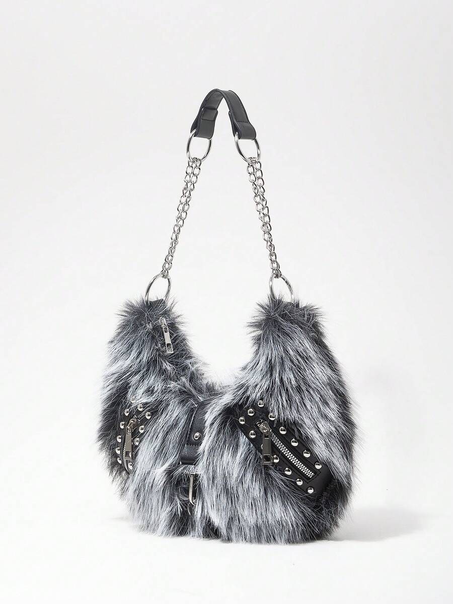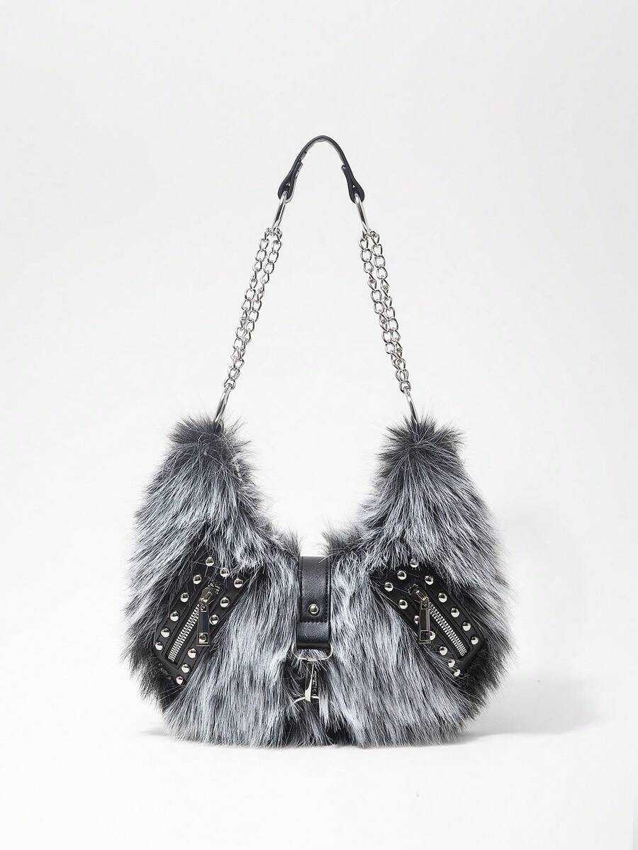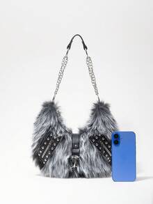 Grunge Punk Bolso de hombro para mujer, bolso hobo, de piel sintética, peludo, bolso de peluche, con remaches, de moda, personalizado, versátil, para la calle, dulce y fresco para chicas, chicas calientes, punk, Y2K, diario, otoño e invierno (patrón aleatorio)