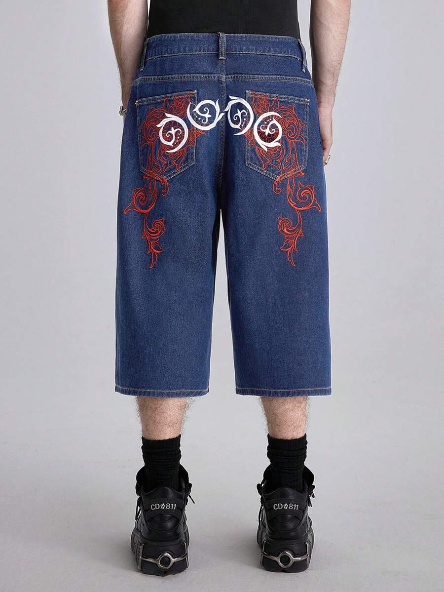 Grunge Punk Pantalones vaqueros de pierna ancha con bordado floral para hombres, escuela