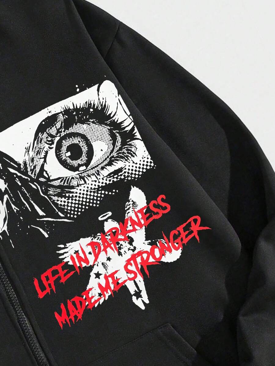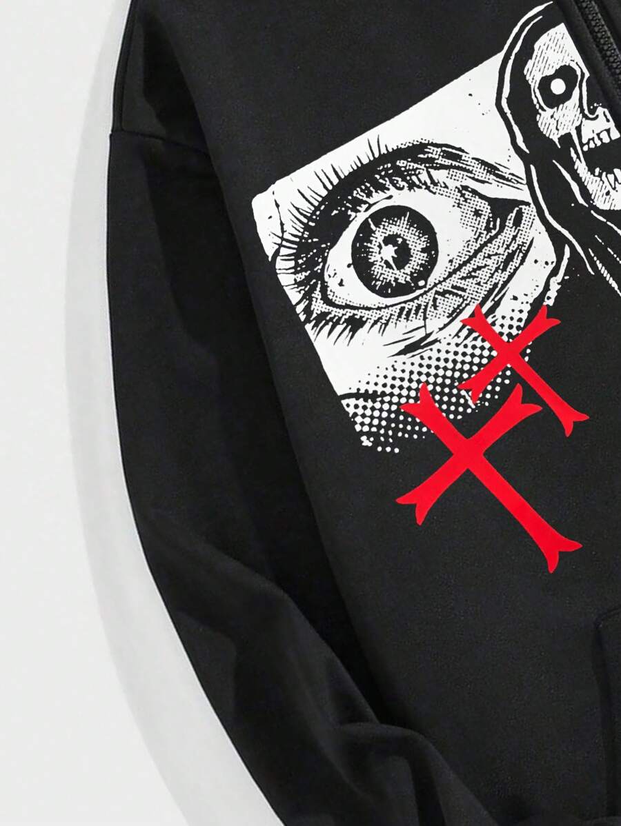 Grunge Punk Sudadera Con Capucha Para Hombres Con Impresión De Ojo Y Calavera Y Cremallera