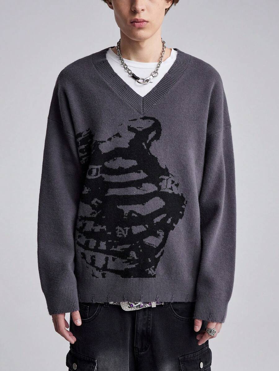 Grunge Punk Jersey casual de cuello en V con patrón de contraste y efecto desgastado para hombres, otoño/invierno