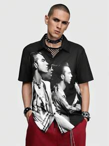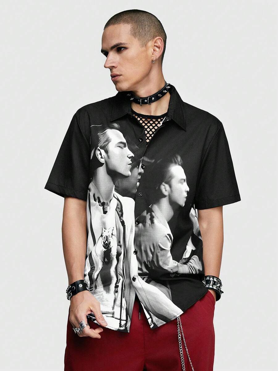 Grunge Punk Camisa Tejida De Manga Corta Con Estampado De Retrato Para Hombre, Adecuada Para Uso Diario En Primavera Y Verano