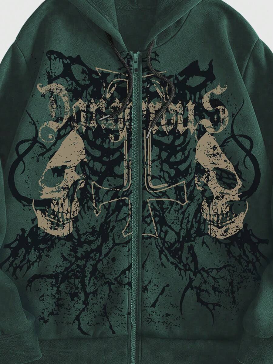Grunge Punk Sudadera con capucha de manga larga con cremallera y estampado de calavera y letras para hombres, escolar
