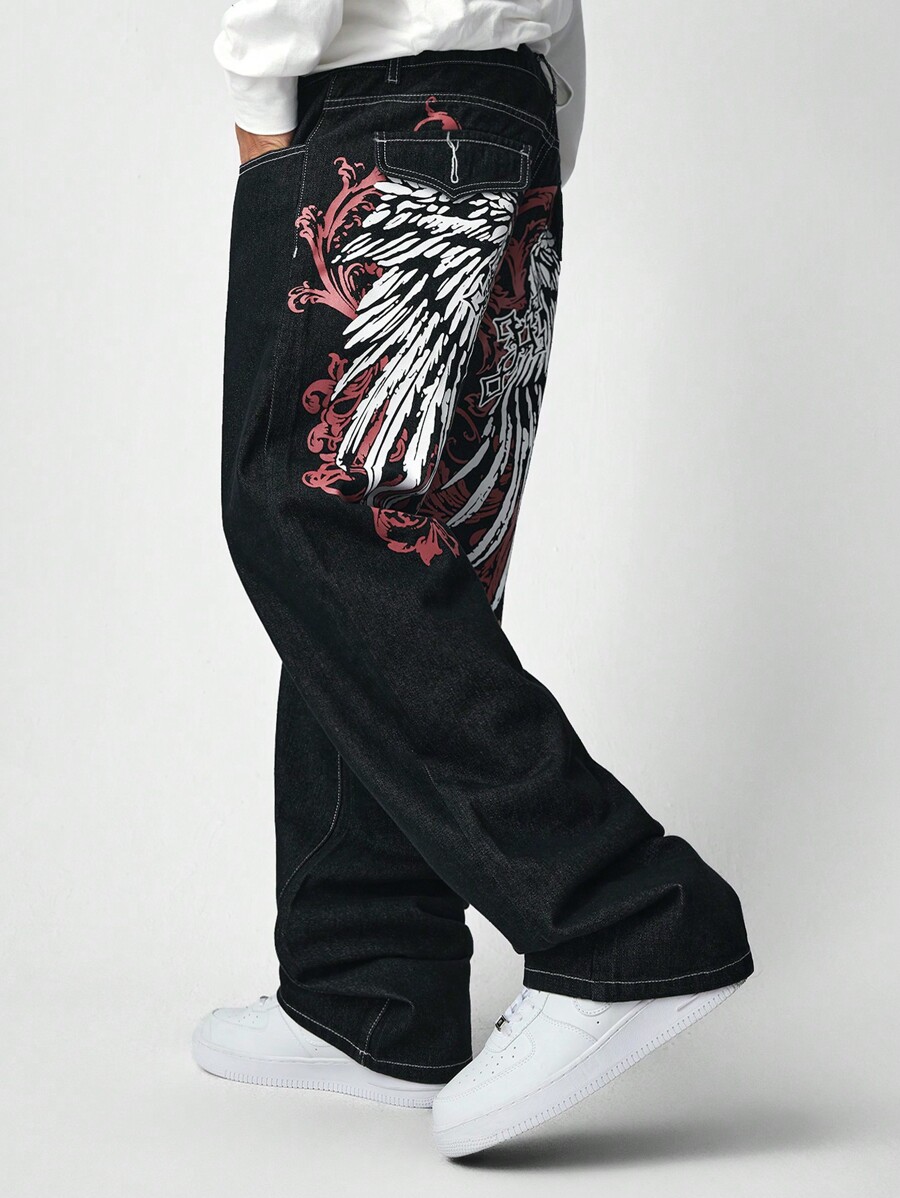 Grunge Punk Jeans casuales sencillos con bolsillo y estampado de alas para uso diario de hombres