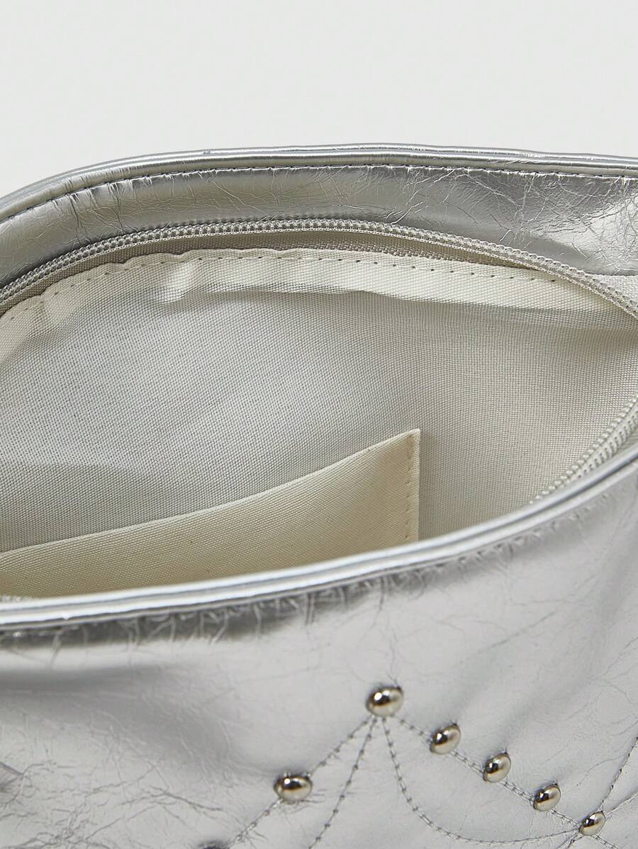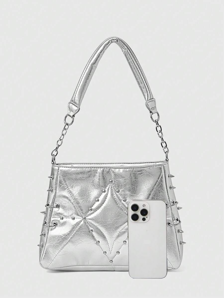 Grunge Punk Bolso de hombro con decoración de remaches de color plateado metálico, bolsa de almacenamiento para uso diario casual