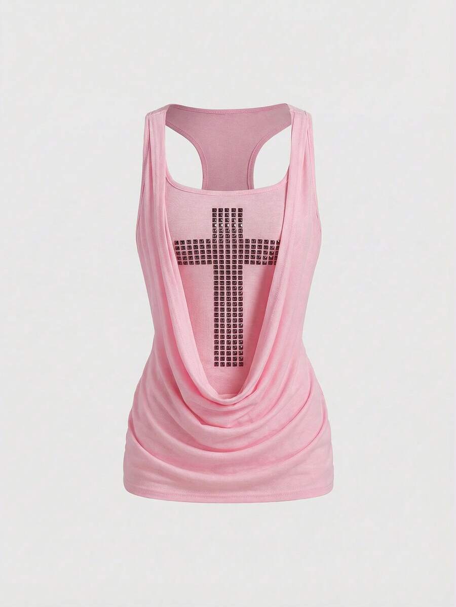 Grunge Punk Camiseta ajustada con cuello profundamente drapeado, cruz de metal y remaches, estilo Millennium Y2K