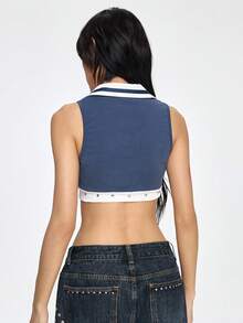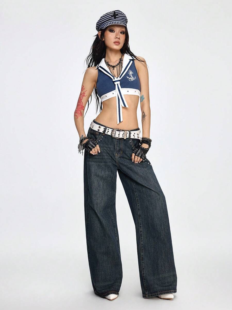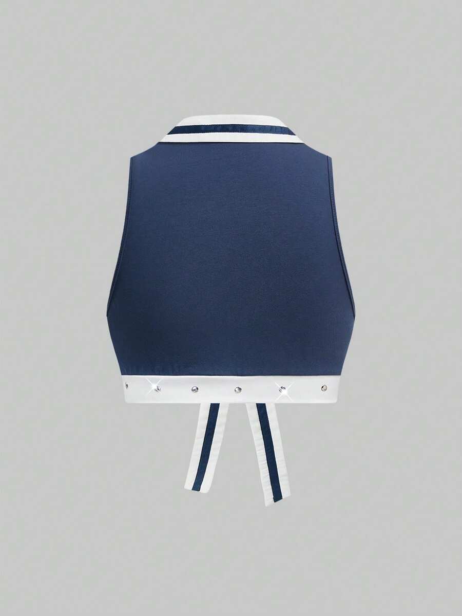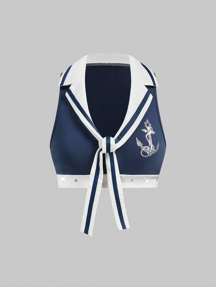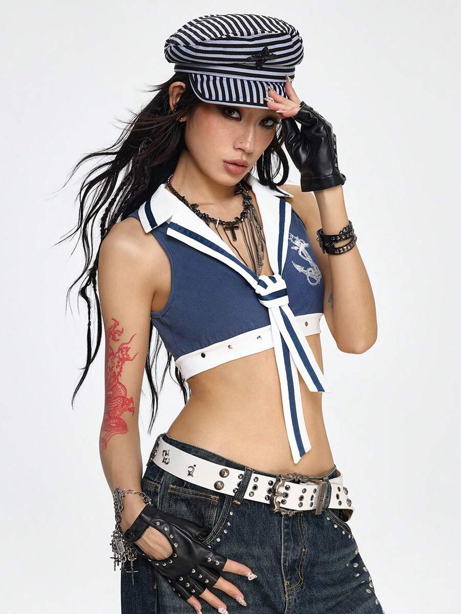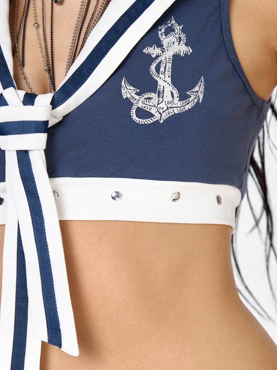 Grunge Punk Top corto con cuello halter de estilo náutico y punk en azul marino