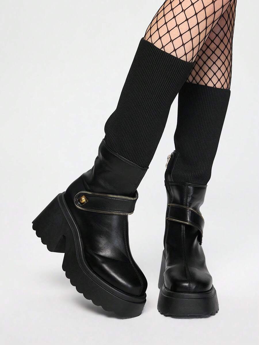 Grunge Punk Nuevas botas casuales de media pantorrilla para mujer de moda de otoño e invierno, con cremallera lateral convertible, suela gruesa, elásticas y plegables, con cremallera decorativa, punta redonda, suela de 9 cm de altura aumentada, plataforma impermeable de 4 cm, para fiesta