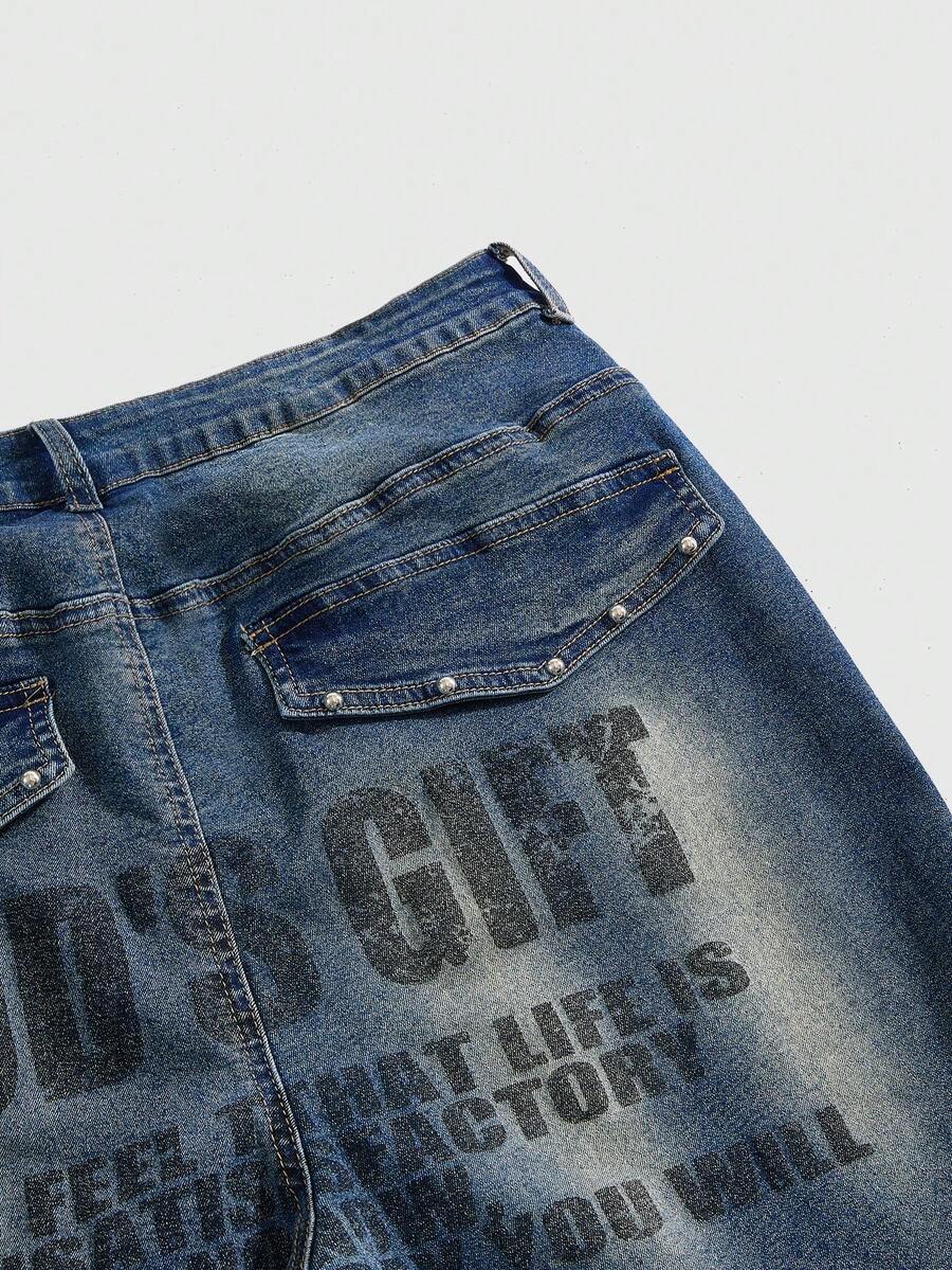 Grunge Punk Jeans acampanados de talla grande con lavado y estampado de eslogan casual