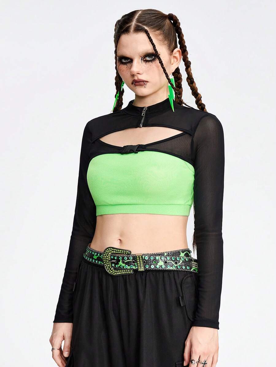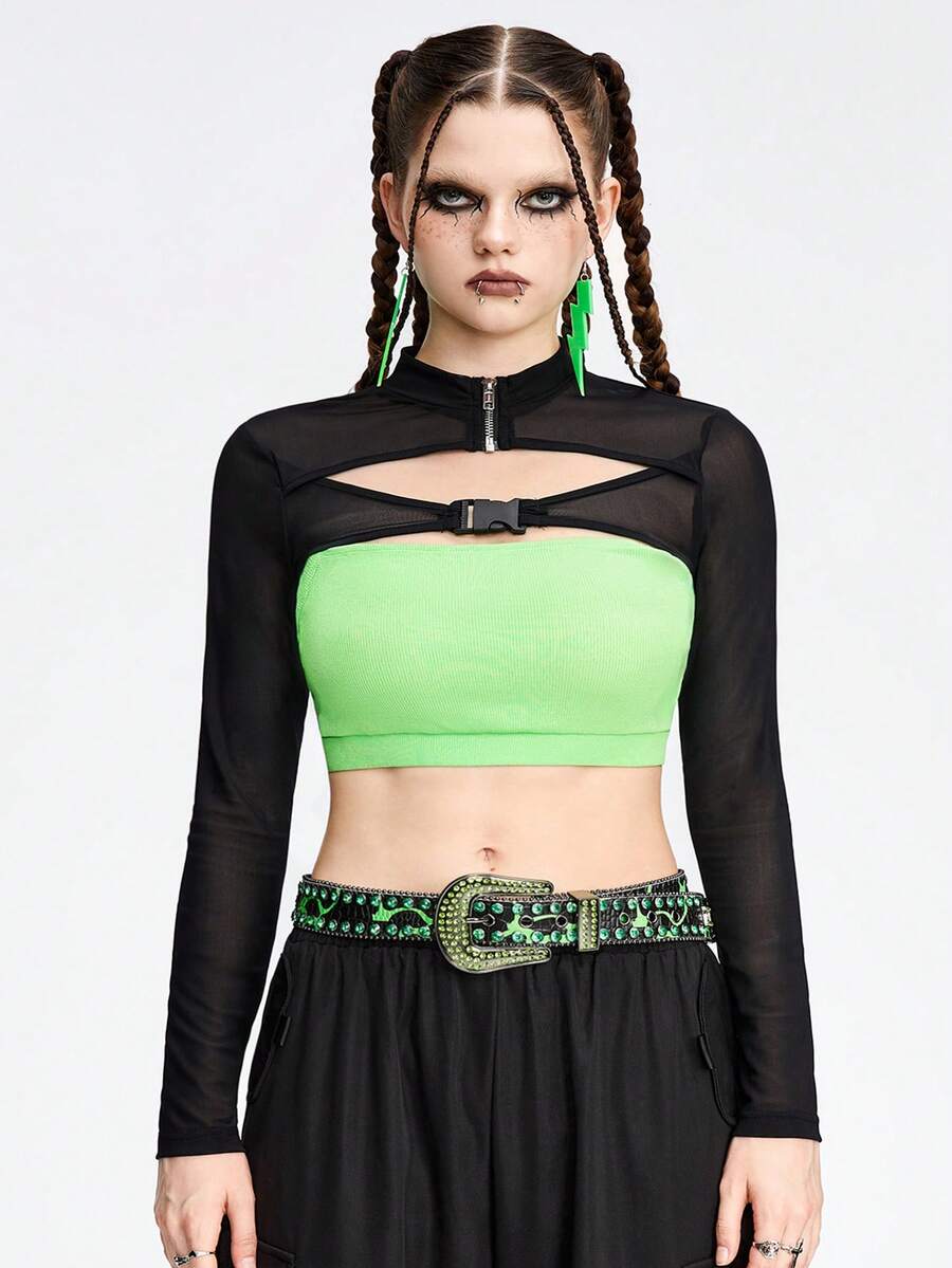 Grunge Punk Blusa para mujer de talla grande, con estilo utilitario, de corte corto, de malla transparente y con ajuste ceñido