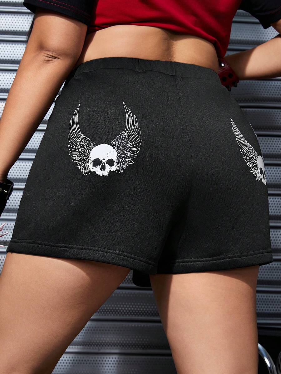 Grunge Punk Conjunto de sudadera con capucha y pantalones cortos de talla grande con estampado de calavera punk y cruz con rhinestones, para la escuela