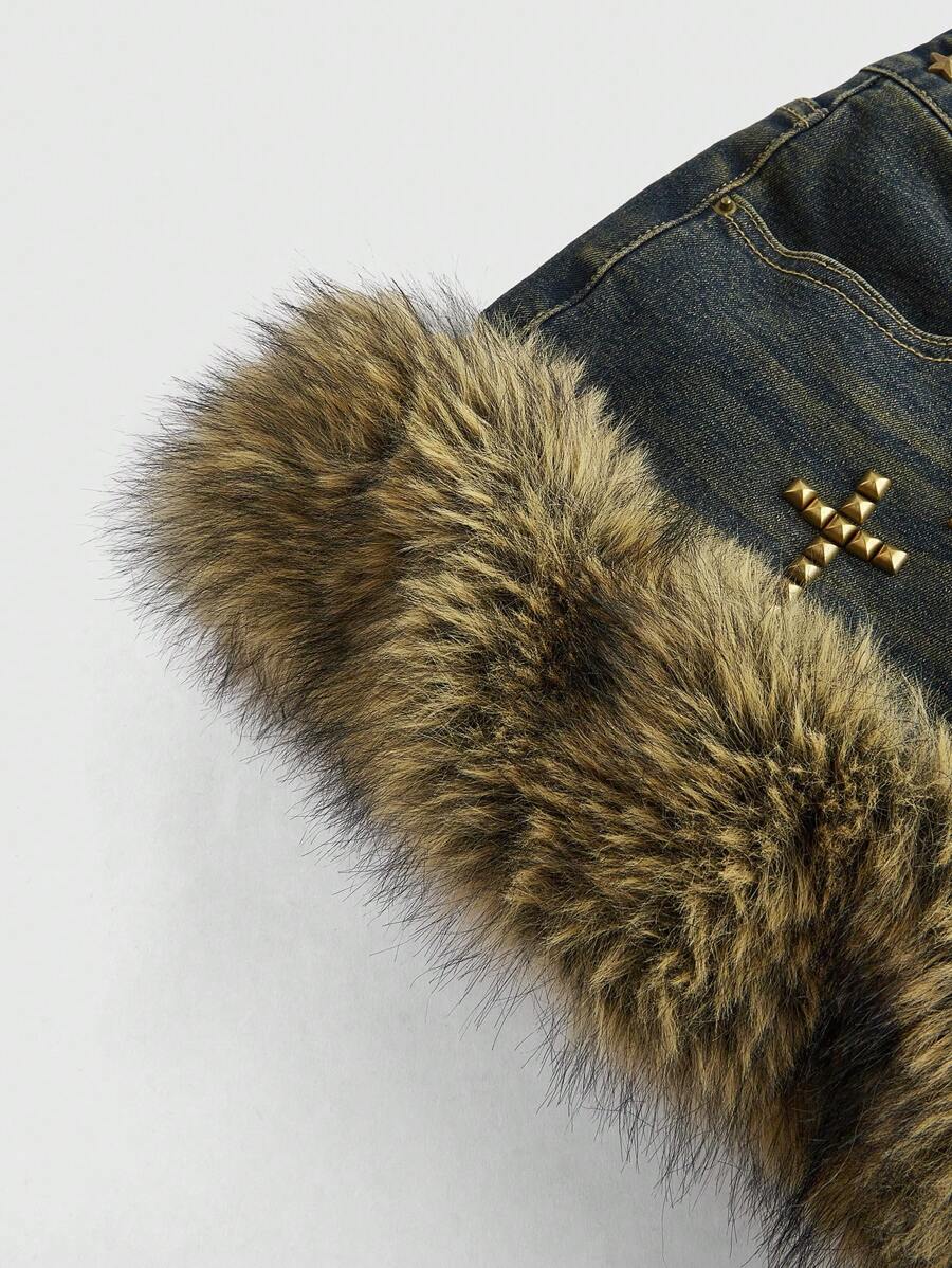 Grunge Punk Minifalda de mezclilla ajustada de tiro bajo con estilo vintage desgastado y desgastado, con remaches en forma de cruz, para mujeres