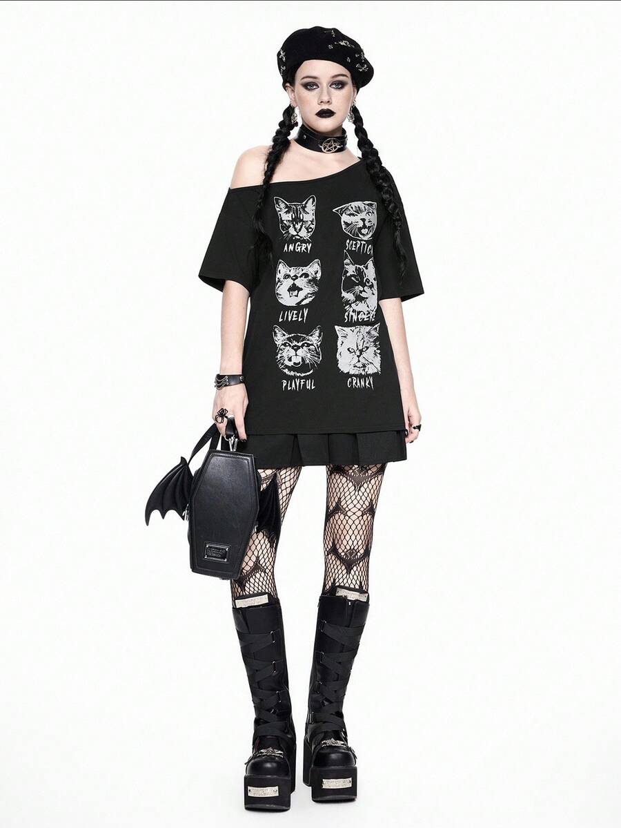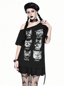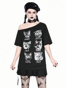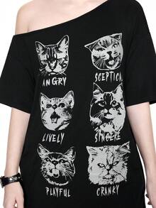 Grunge Punk Camiseta holgada con cuello asimétrico y estampado de gato, estilo punk Y2K