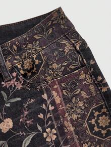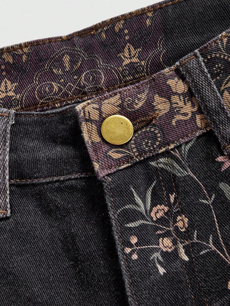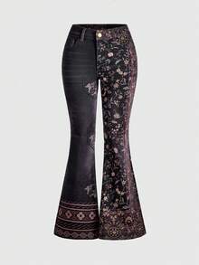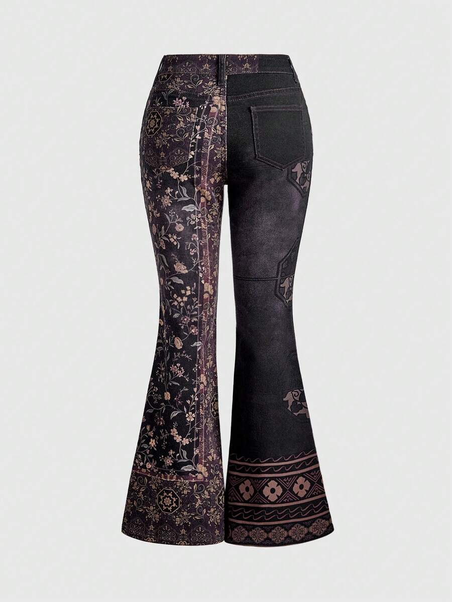 Grunge Punk Jeans acampanados de talle súper bajo con estampado floral de contraste en estilo retro hippie