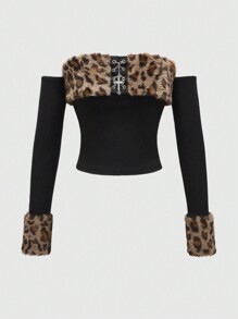 Grunge Punk Top corto sin mangas con cuello de piel y parches con estampado de leopardo para mujeres, estilo vintage Y2K