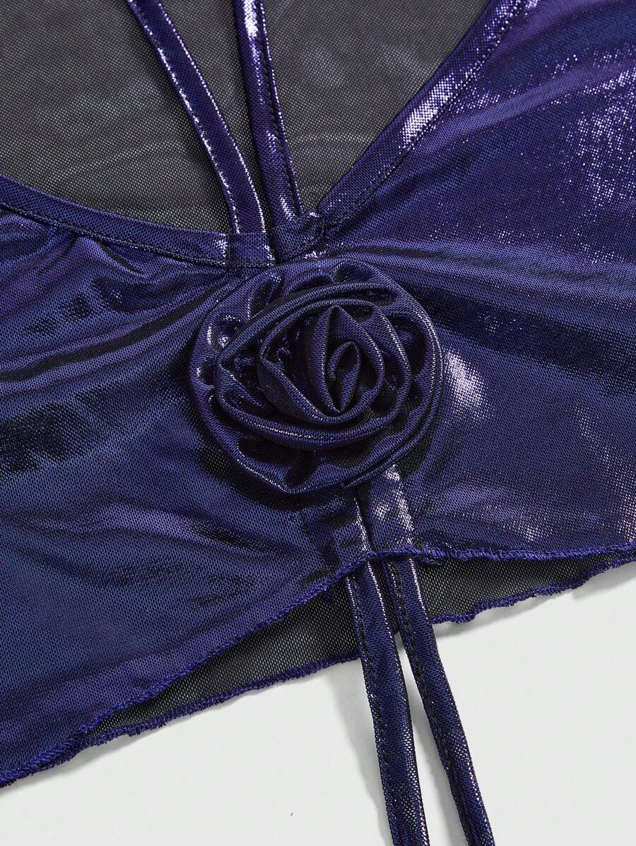 Grunge Punk Vestido de vacaciones para mujer corto y con escote bajo, transparente y brillante. Presenta cuello con cordones de rosa, lazo, y mangas acampanadas en azul, morado y multicolor