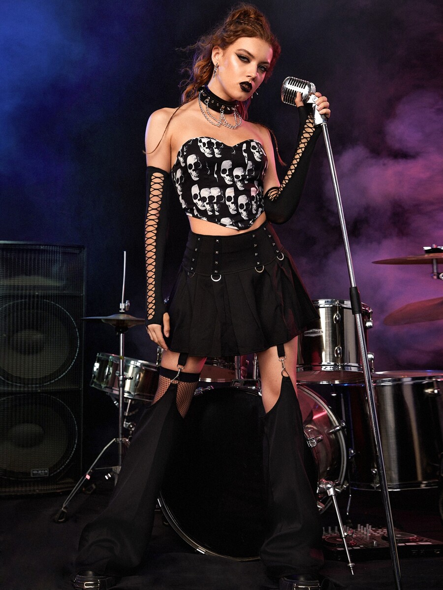 Grunge Punk Top bandeau estampado de cráneo de espalda con cordón