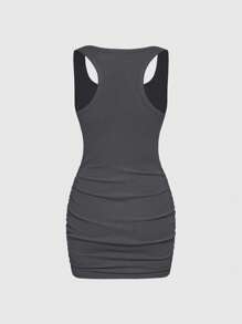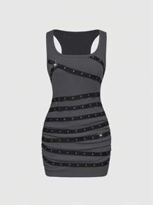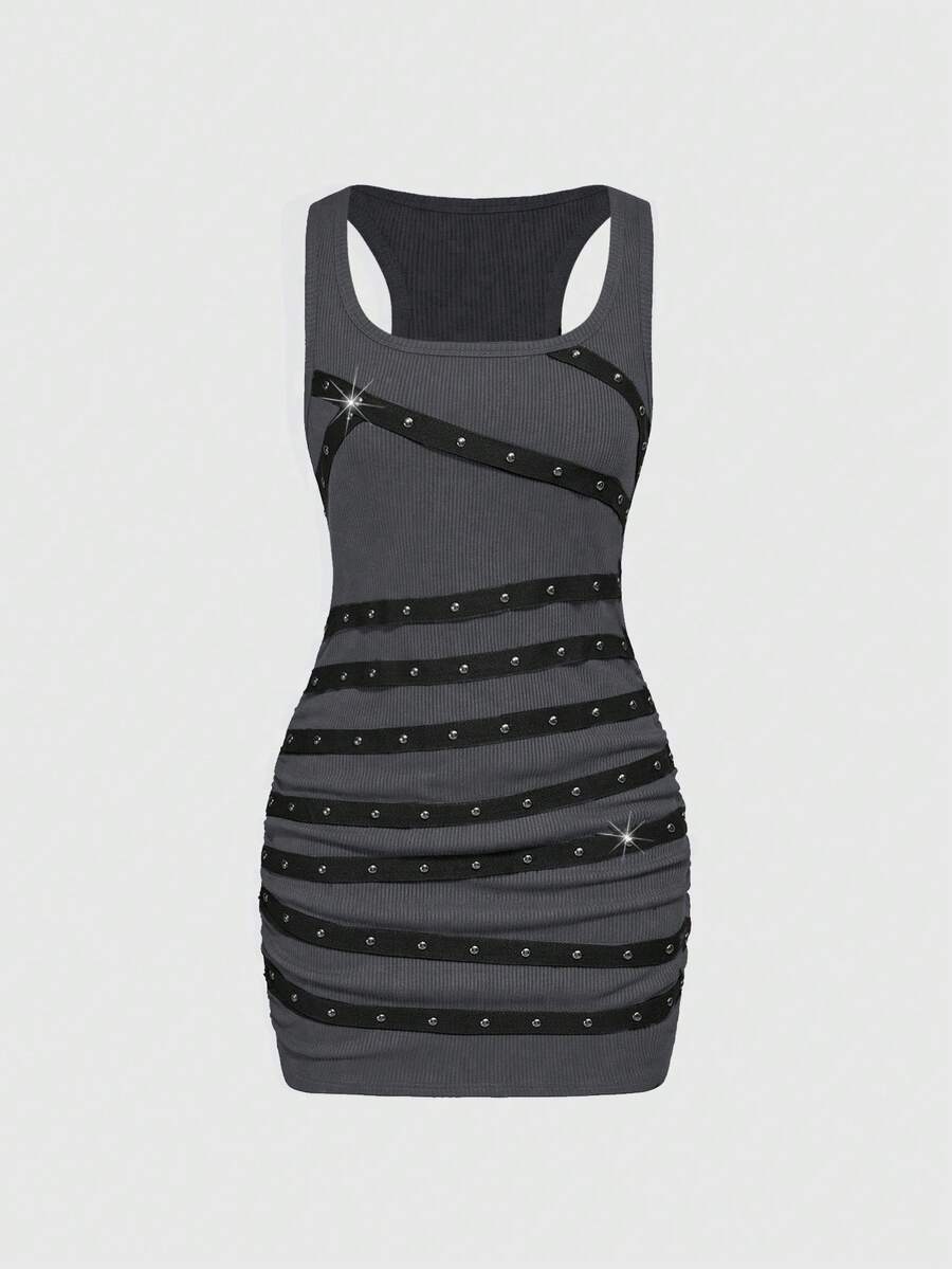 Grunge Punk Vestido negro mini sexy de mujer con cuello redondo sin mangas y escote bajo, con detalles de tachuelas, cristales y cinta, adecuado para el verano, la playa, la graduación, la Pascua, conciertos, vacaciones en Nashville