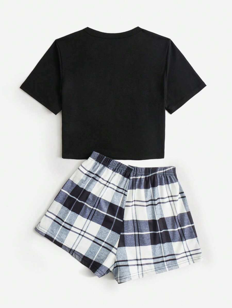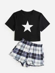 Grunge Punk con estampado de estrella Camiseta & de cuadros Shorts Set homewear