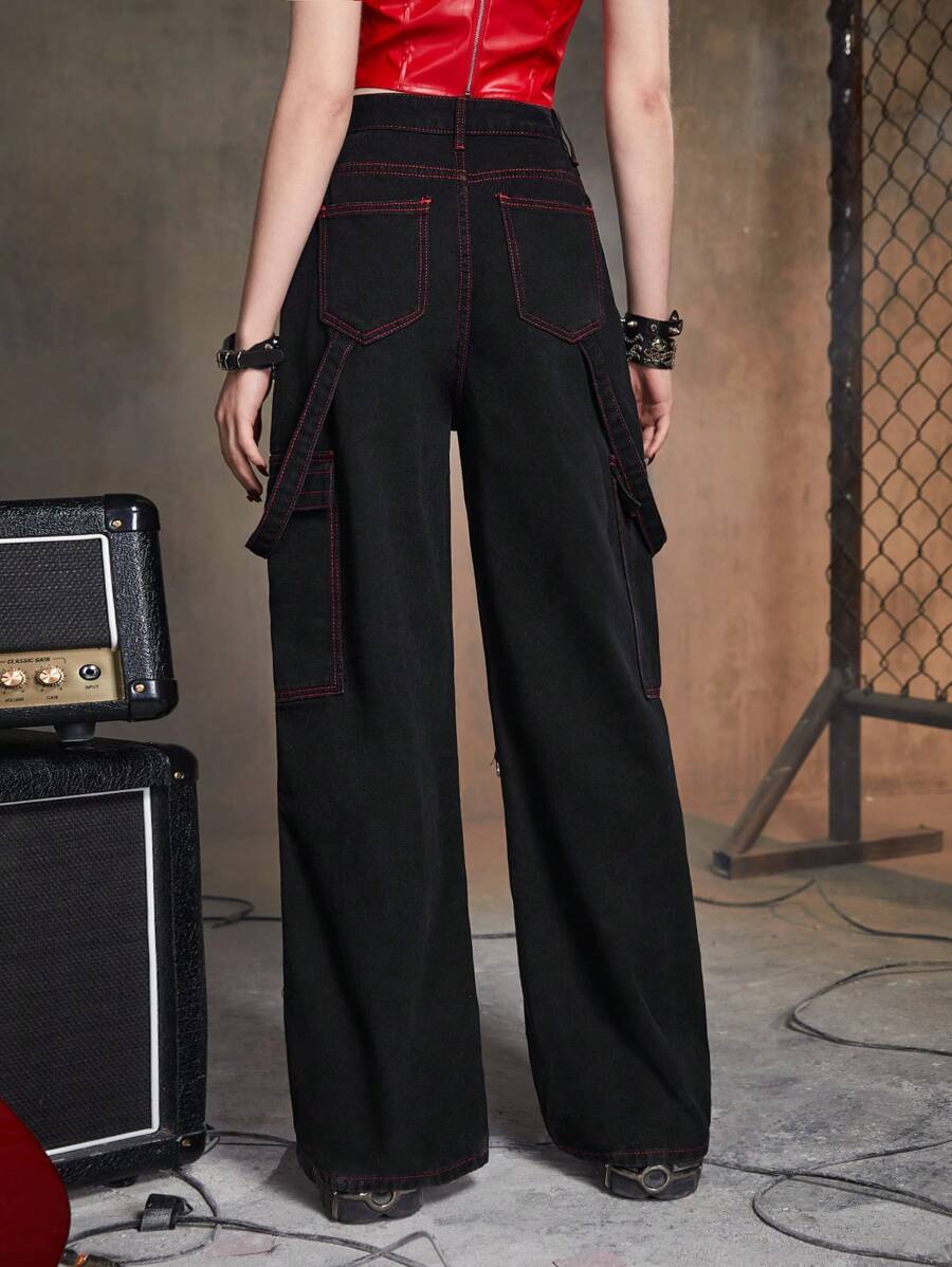Grunge Punk Jeans tipo cargo con bolsillo con tapeta y acabados con pespuntes, para la escuela