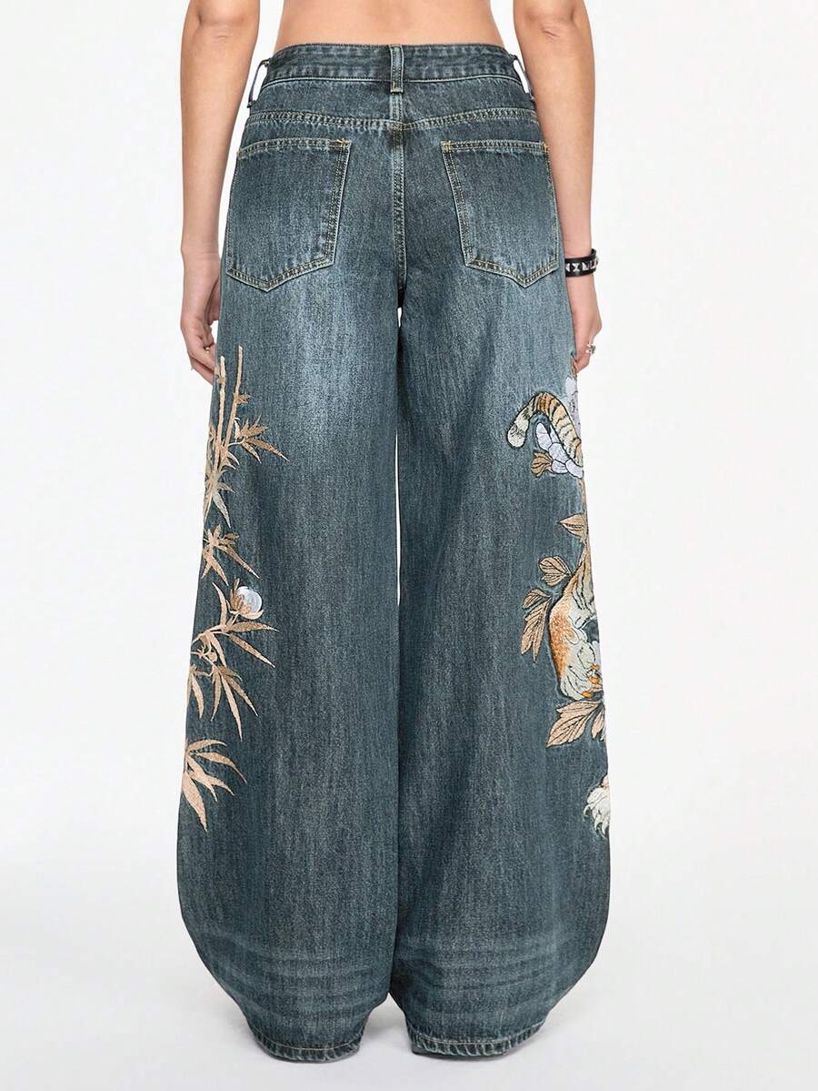Grunge Punk Jeans anchos y sueltos con bordado chino de tigre y flores, estilo callejero retro, unisex