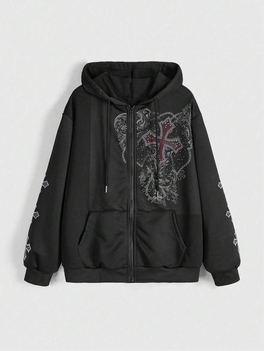 Grunge Punk Sudadera con capucha con cremallera con adornos de cruz y vid vintage