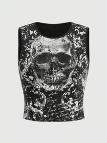 Grunge Punk Camiseta Sin Mangas De Corte Entallado, Desgastada, Con Estampado De Calavera Y Vid, Estilo Vintage, Para Festival De Música, Acanalada, Lavada Con Nieve Y Con Agujeros